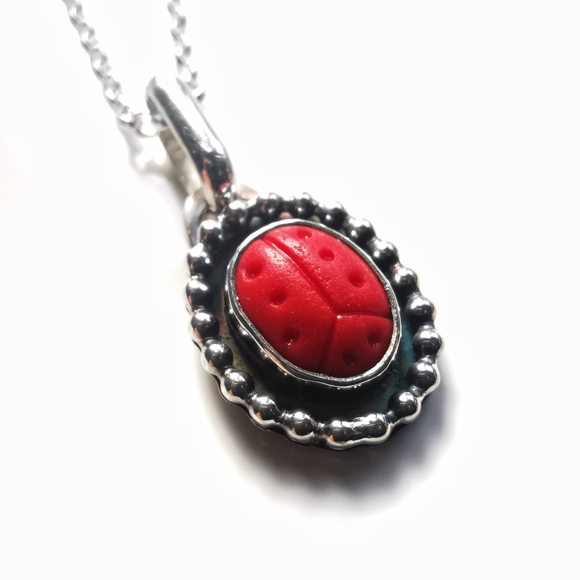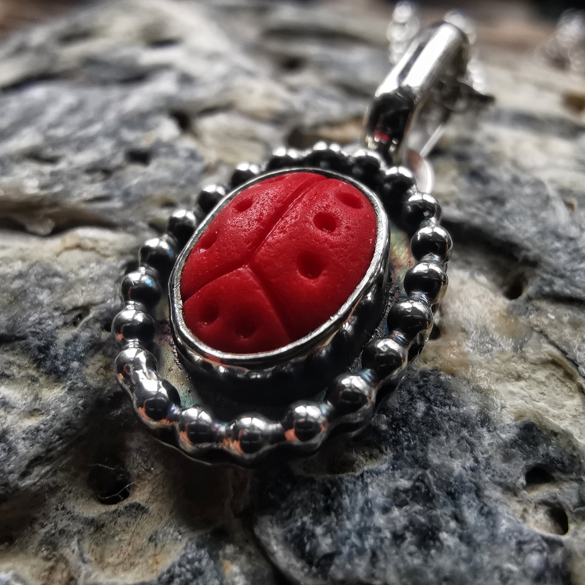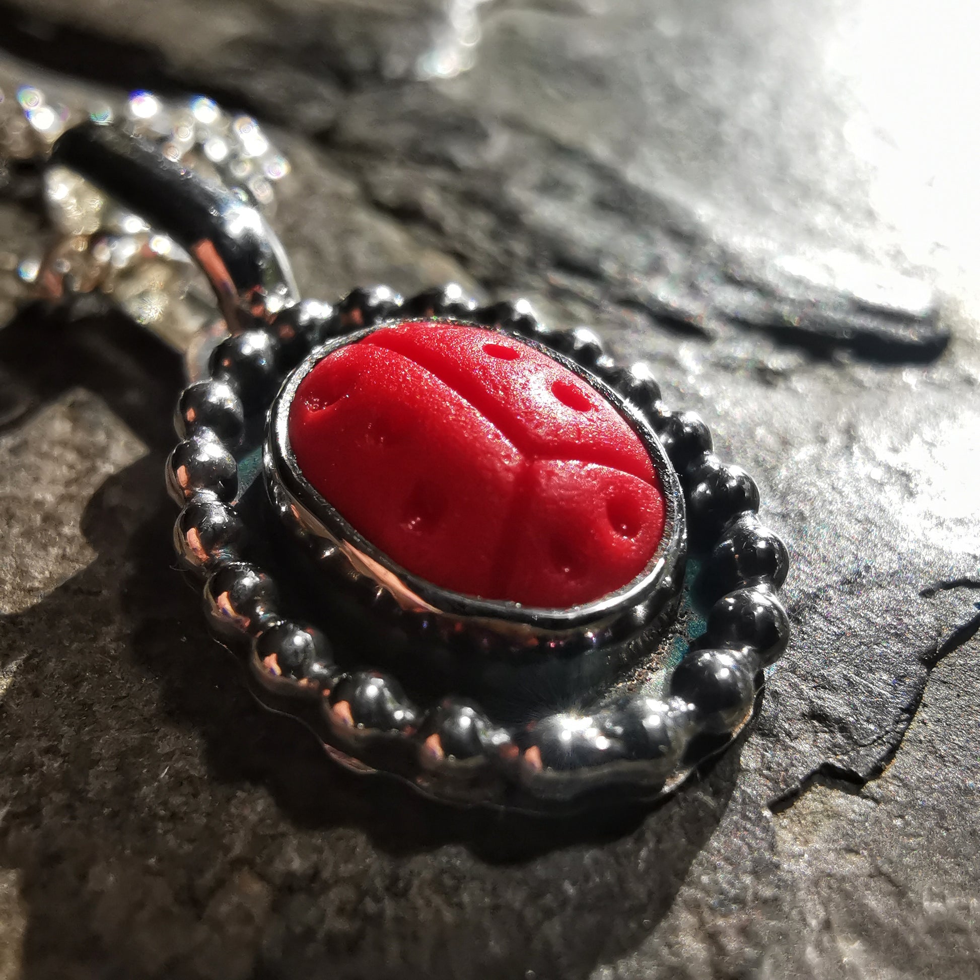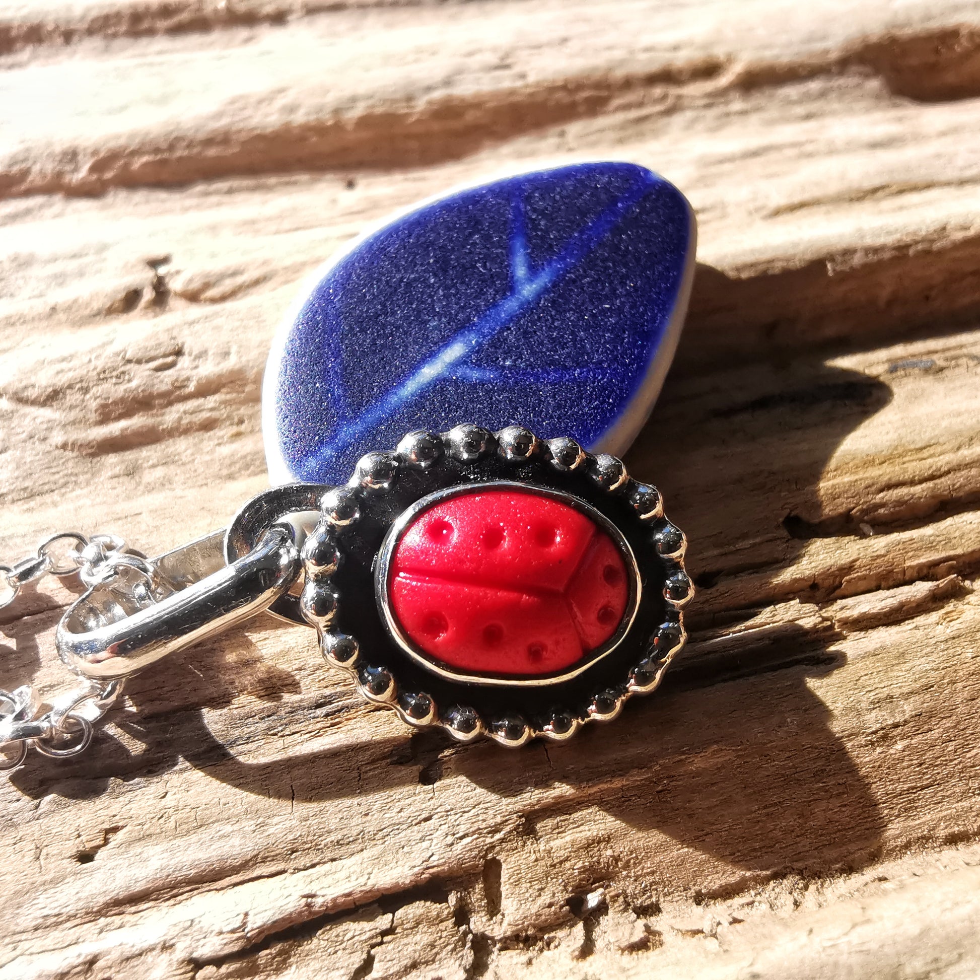 One of a kind pendant composed with genuine Scottish tiny red sea glass ladybird/ladybug found by me on a beach in Edinburgh. The ladybird cabochon is set in silver bezel, the chain is sterling silver.