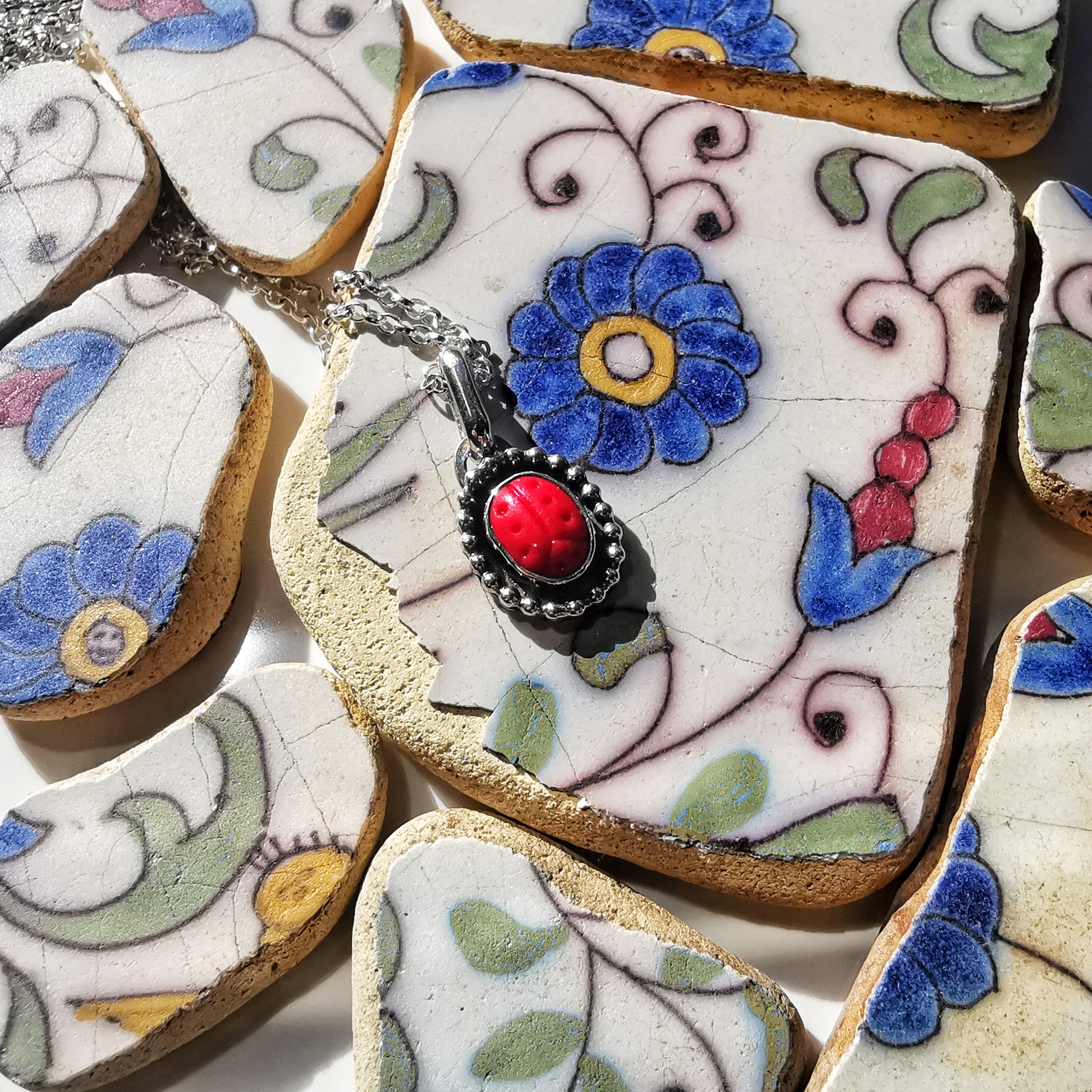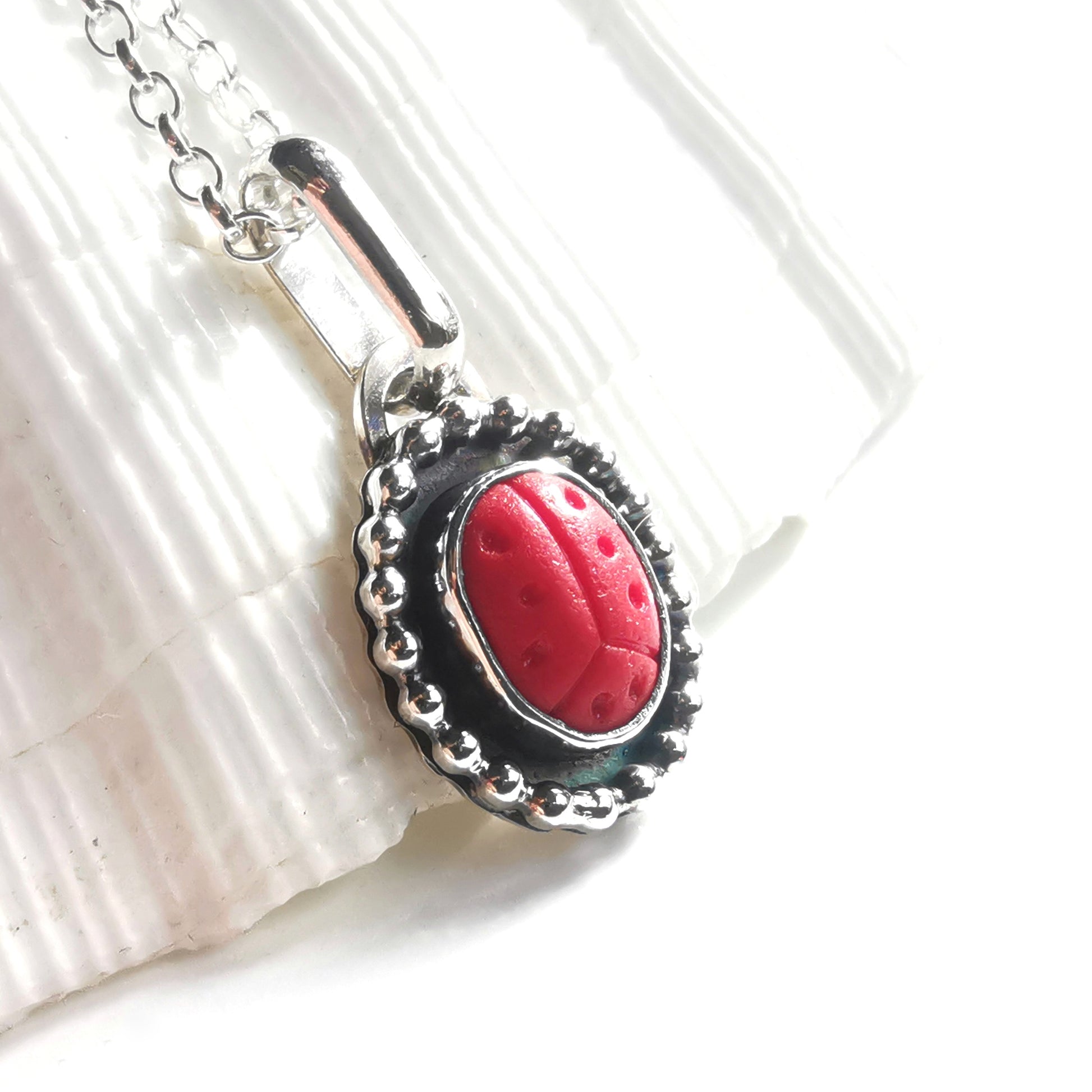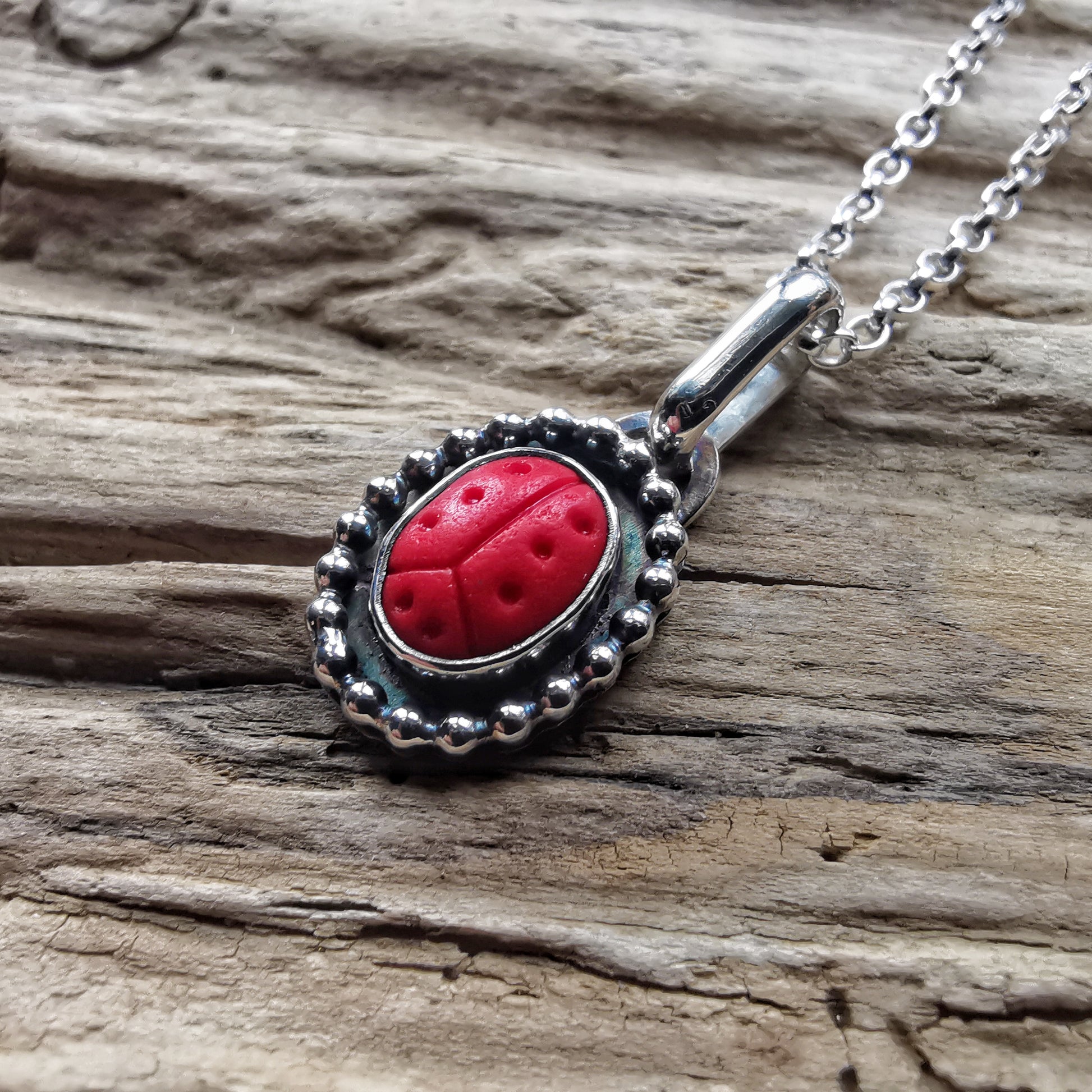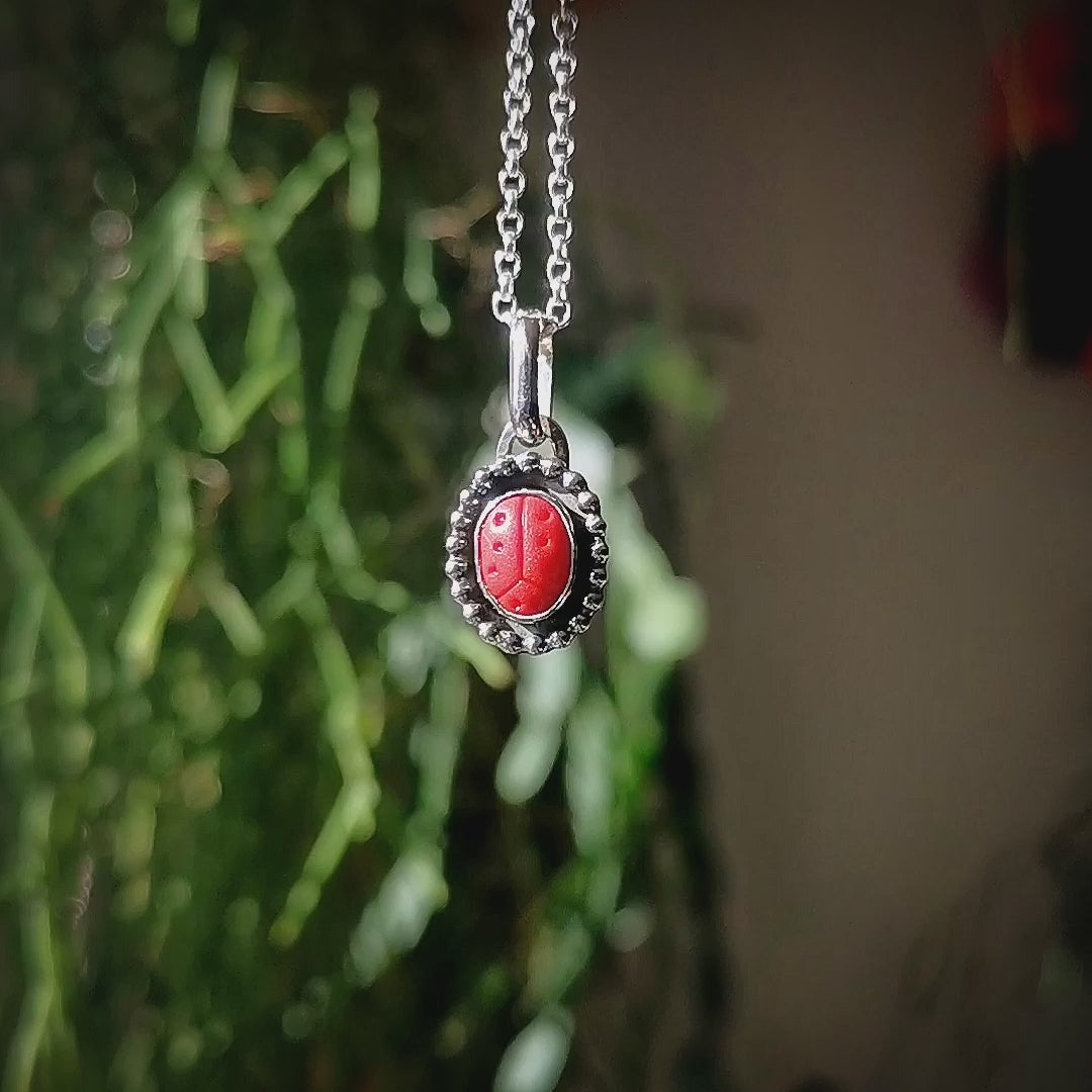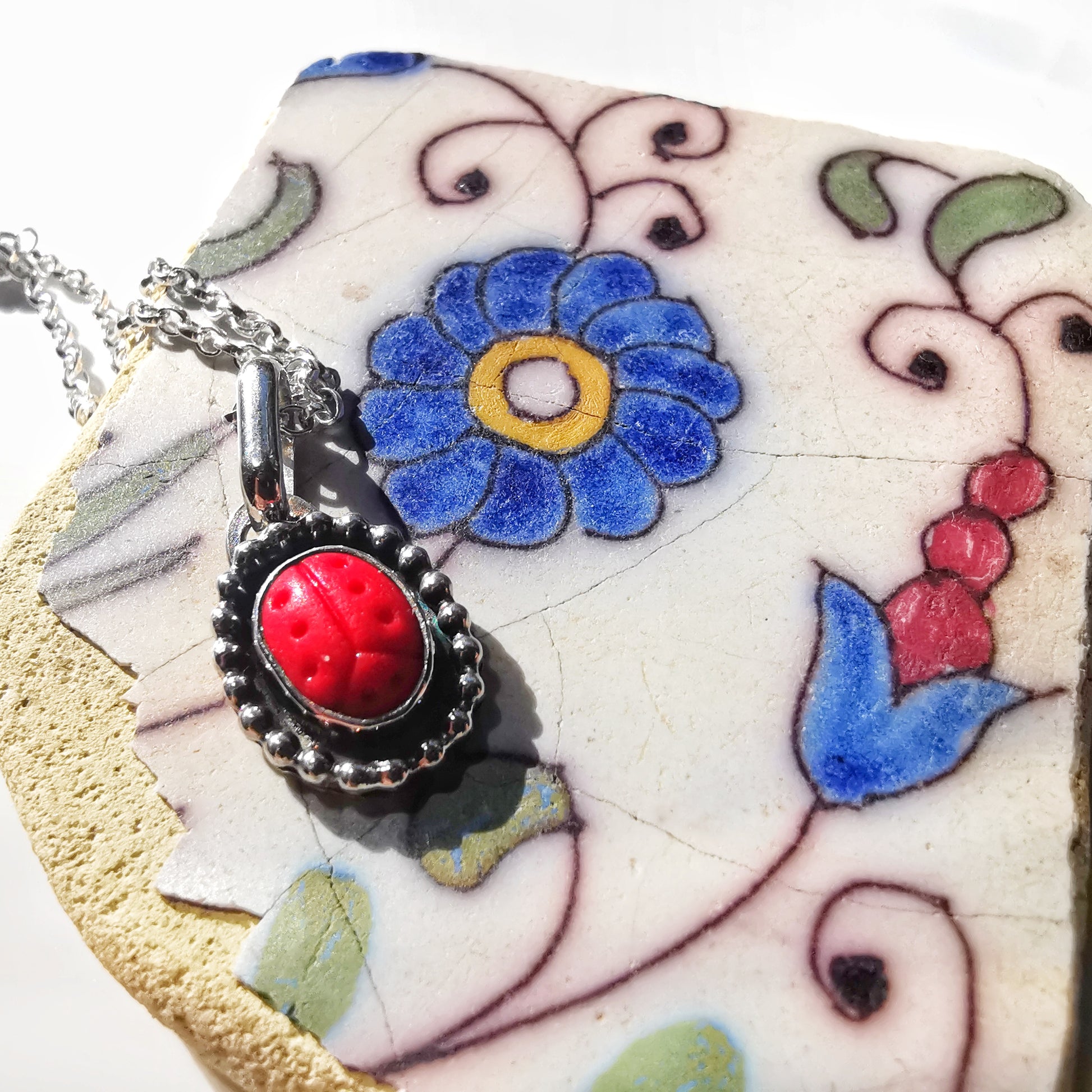 One of a kind pendant composed with genuine Scottish tiny red sea glass ladybird/ladybug found by me on a beach in Edinburgh. The ladybird cabochon is set in silver bezel, the chain is sterling silver.