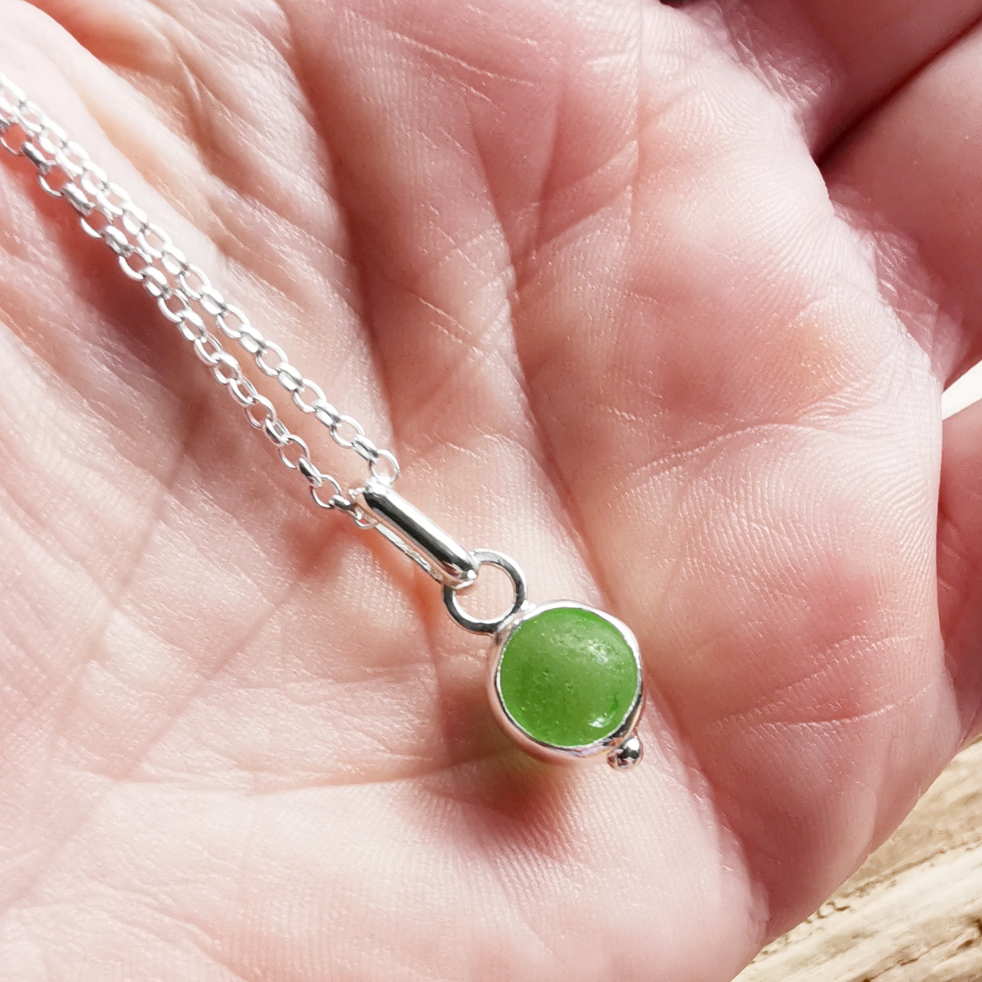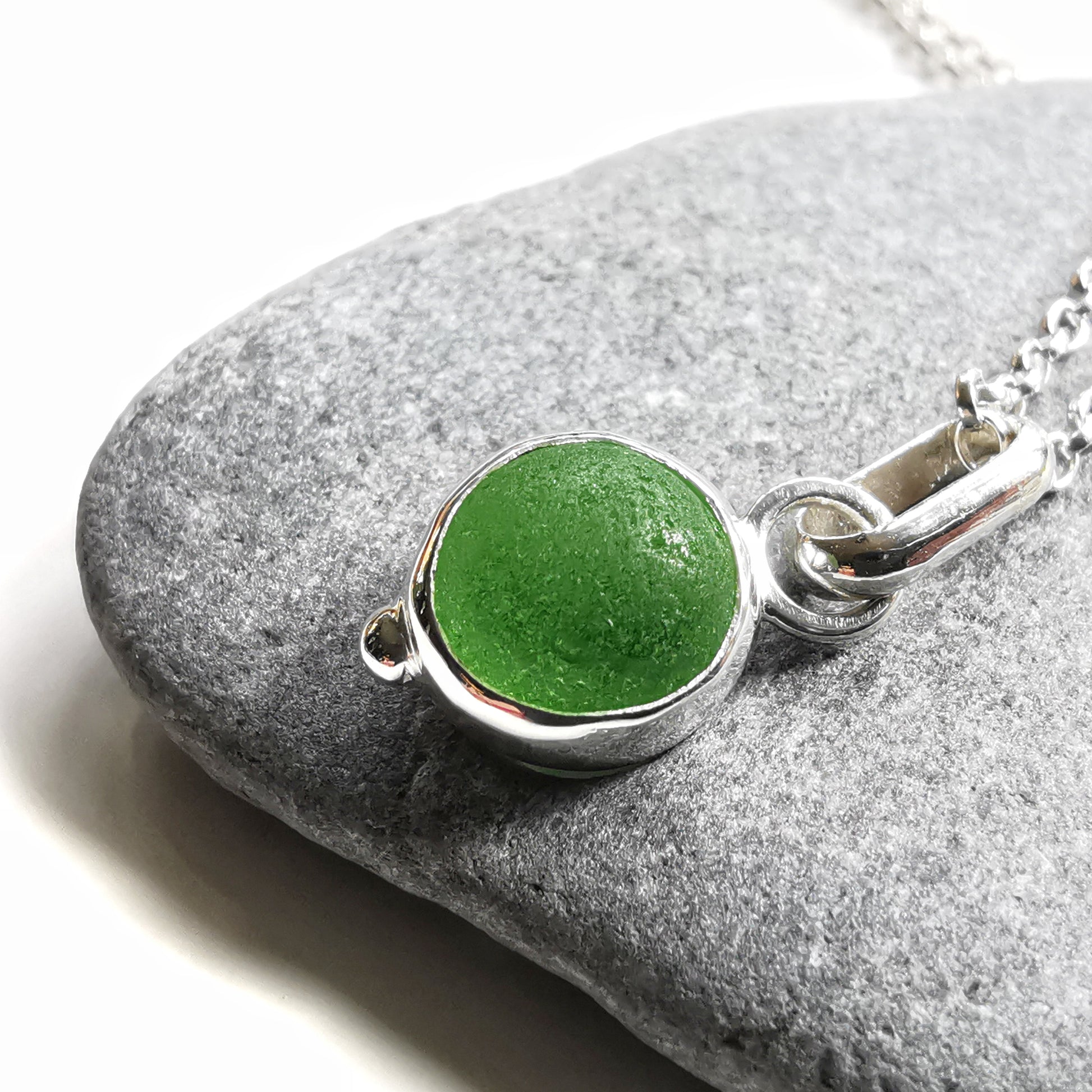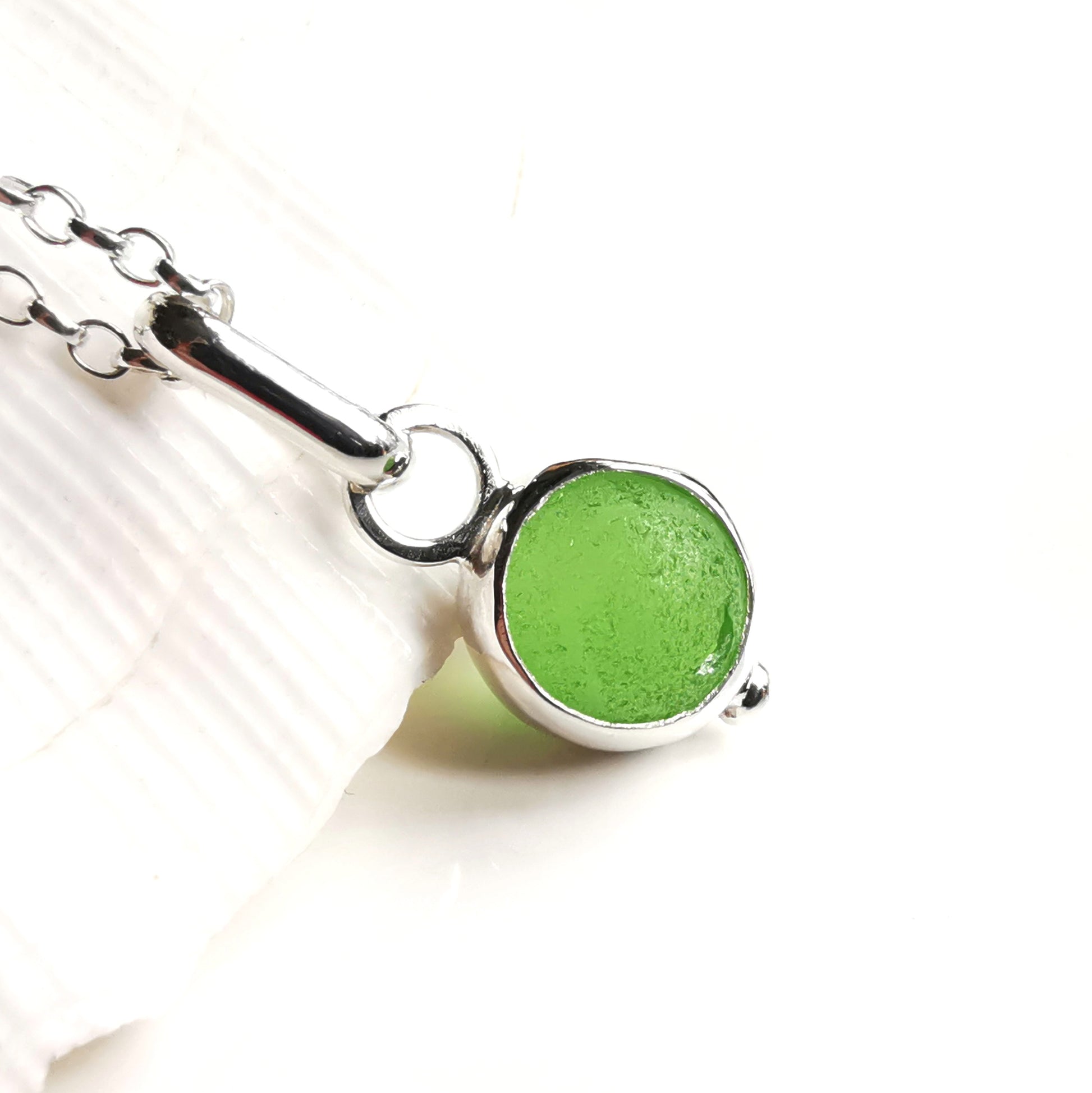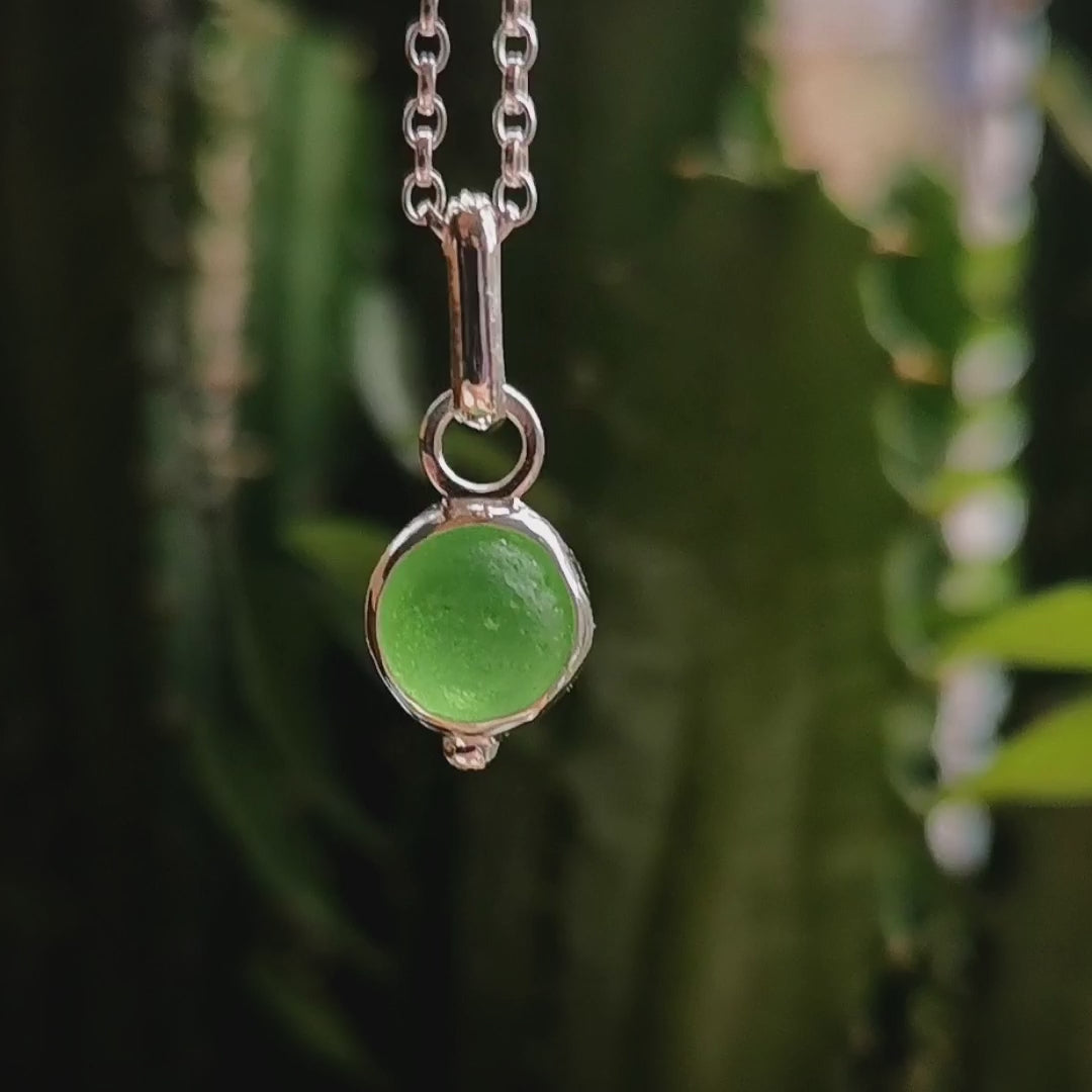 Tiny Scottish green sea glass marble & sterling silver pendant.