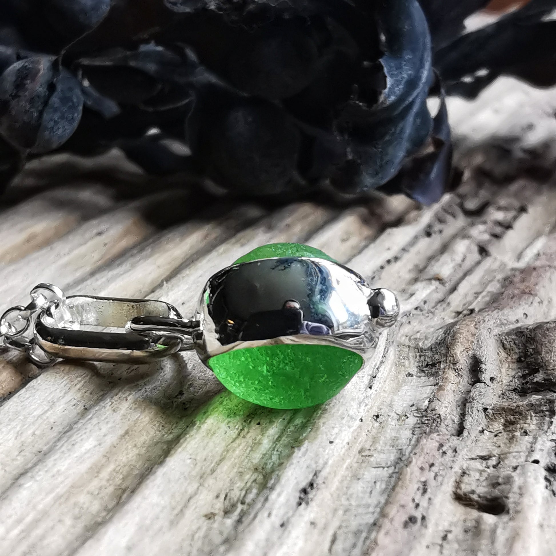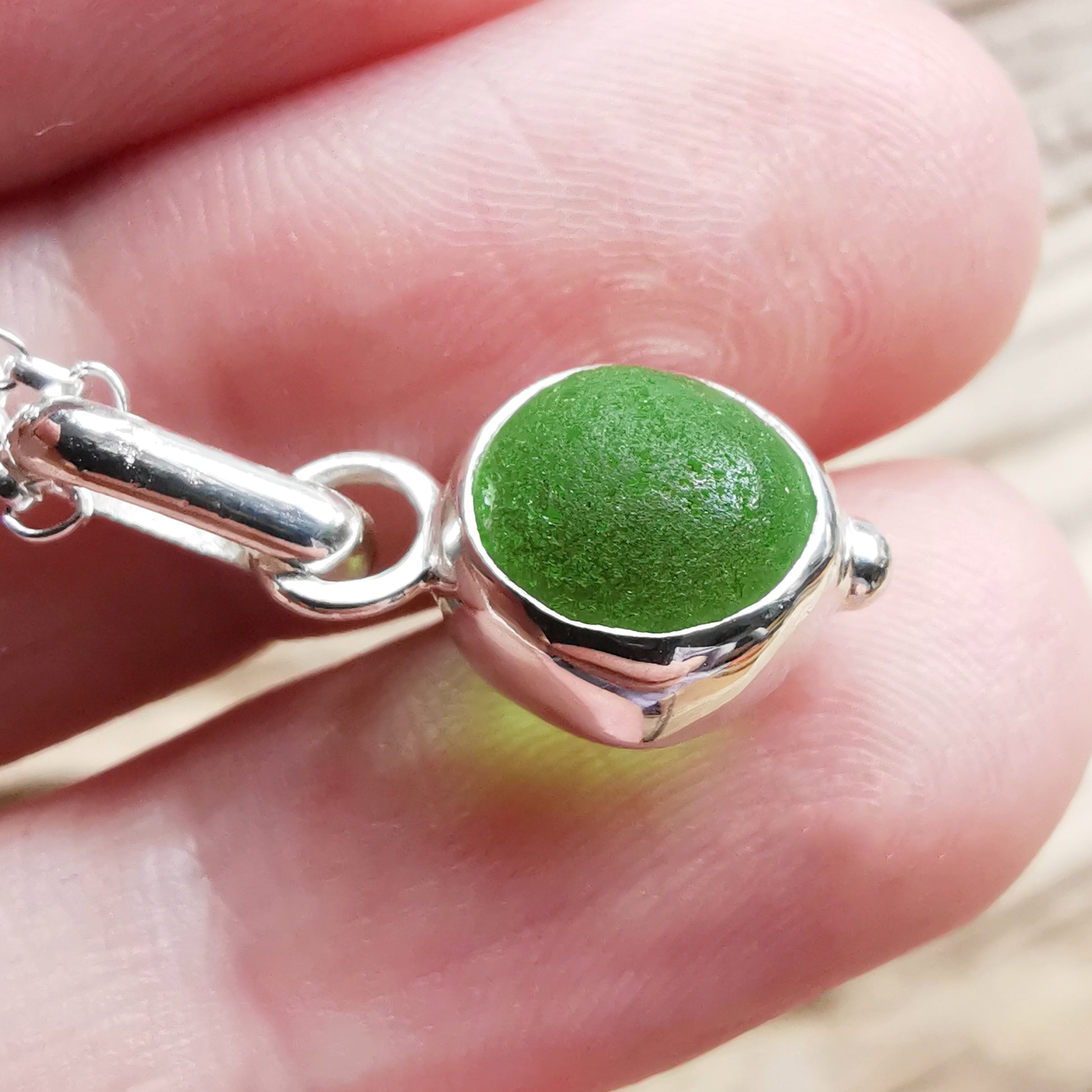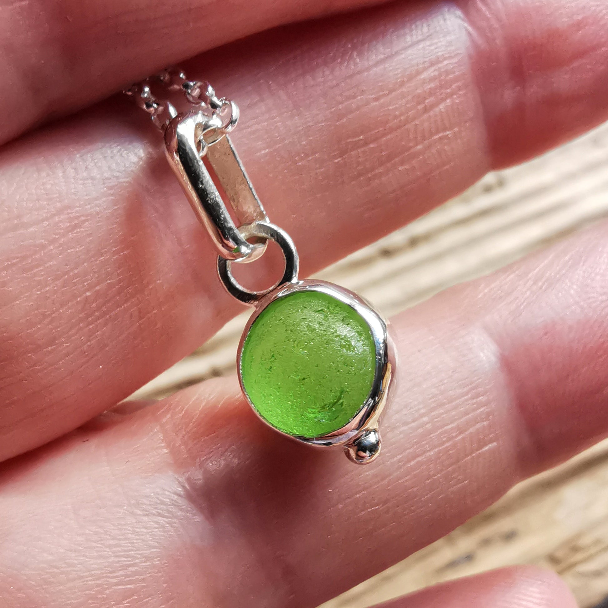 Tiny Scottish green sea glass marble & sterling silver pendant.