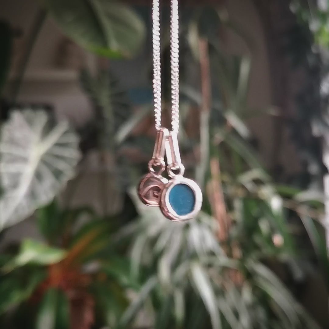 Tiny Scottish teal blue sea glass and wave pebble duo of sterling silver pendants.