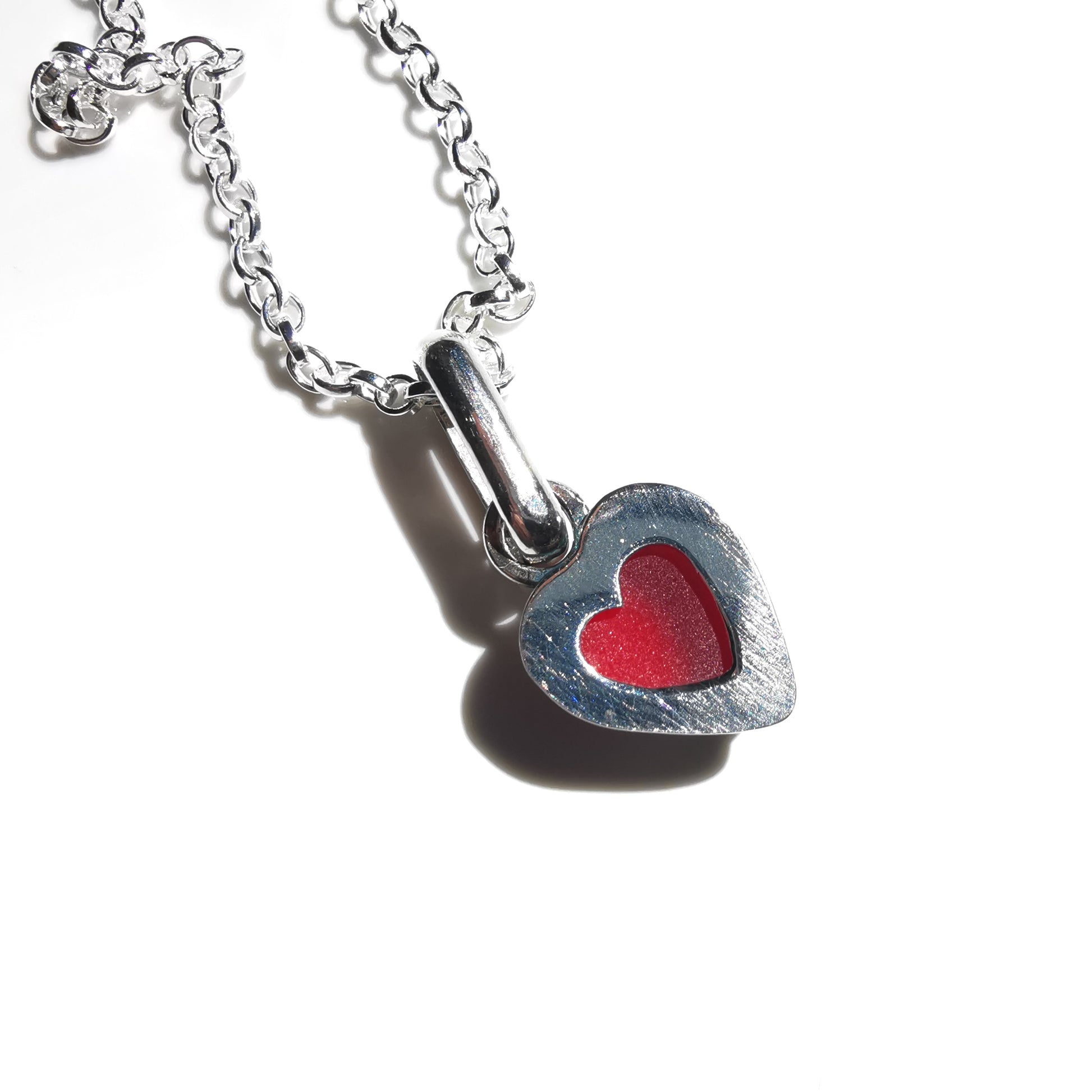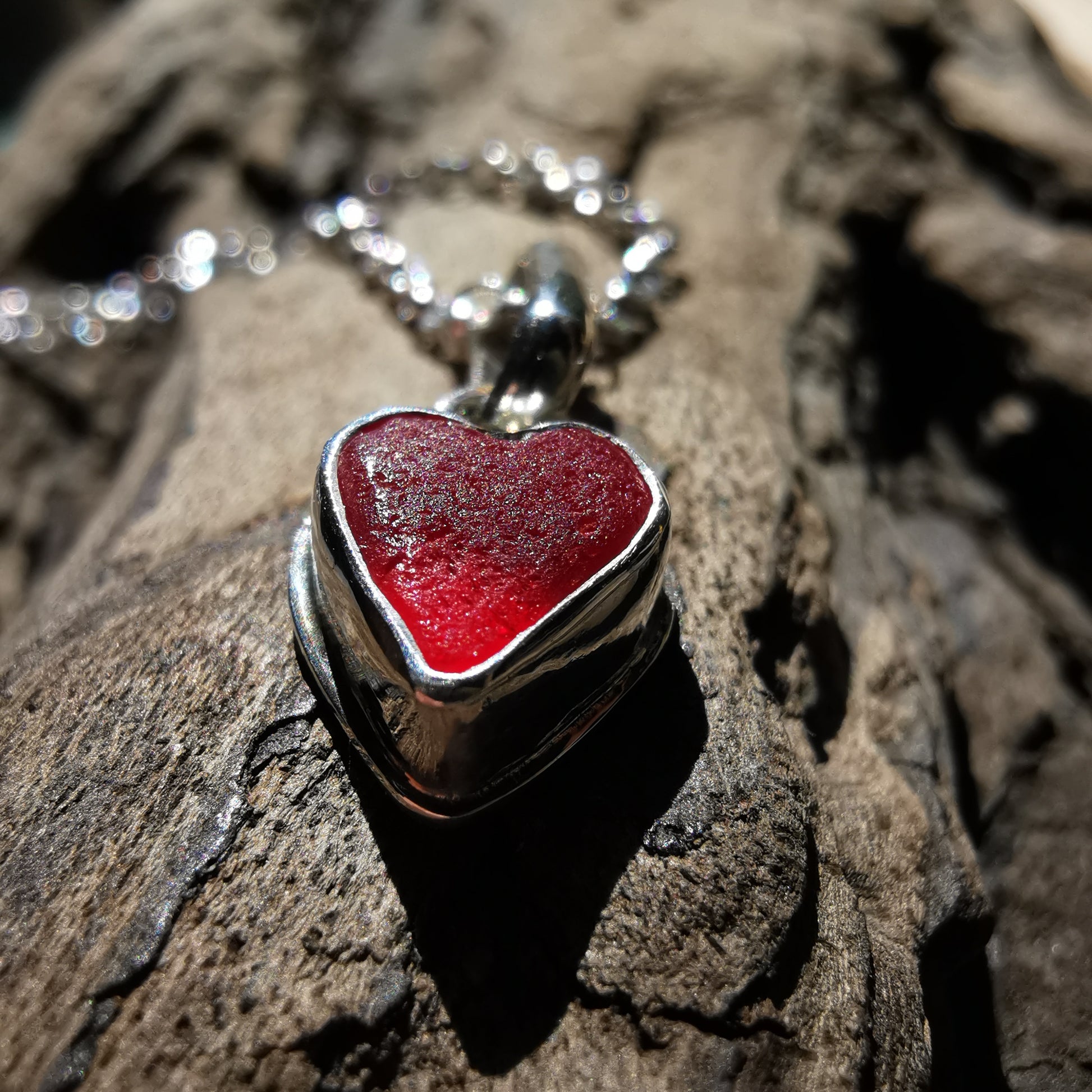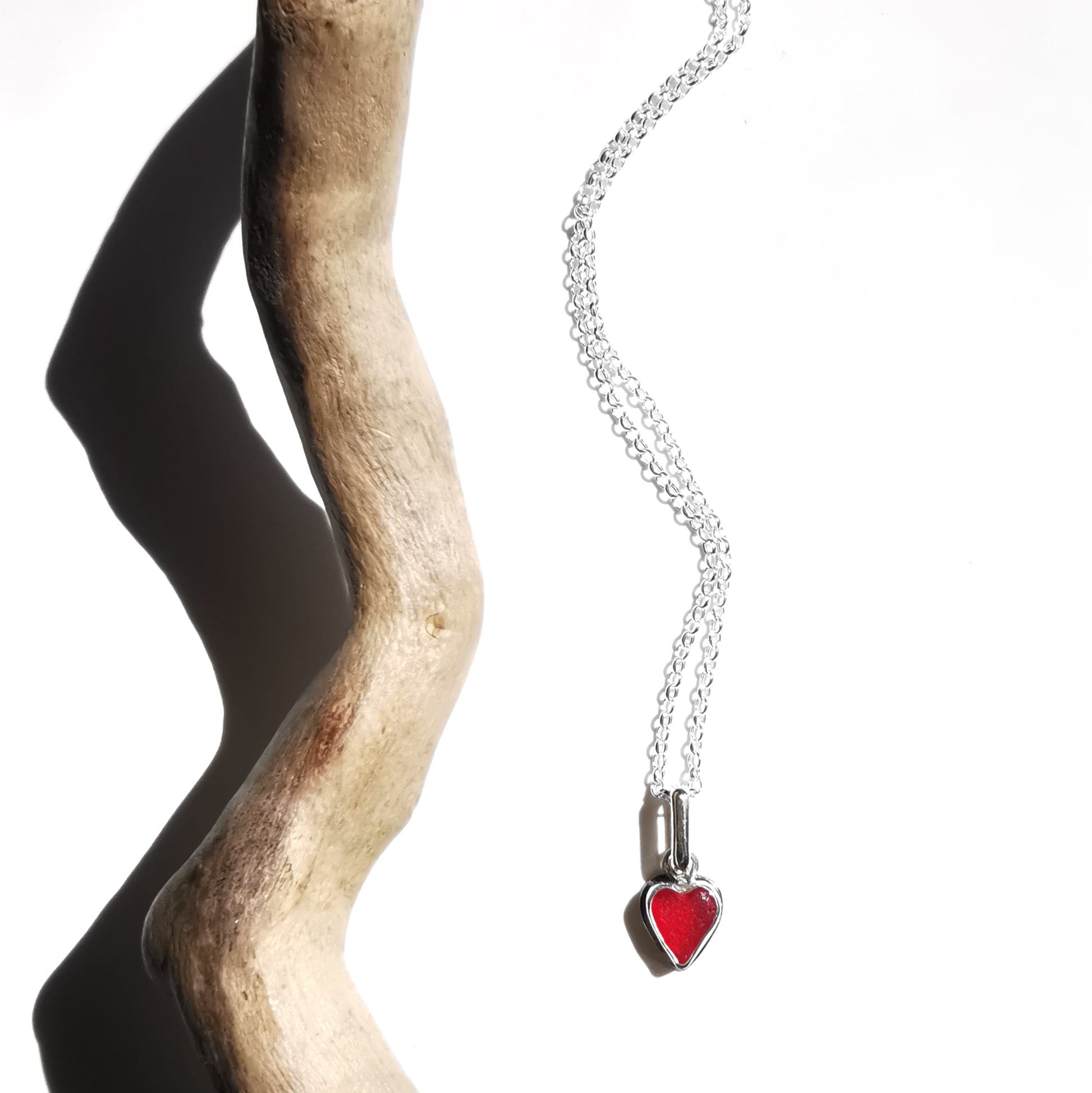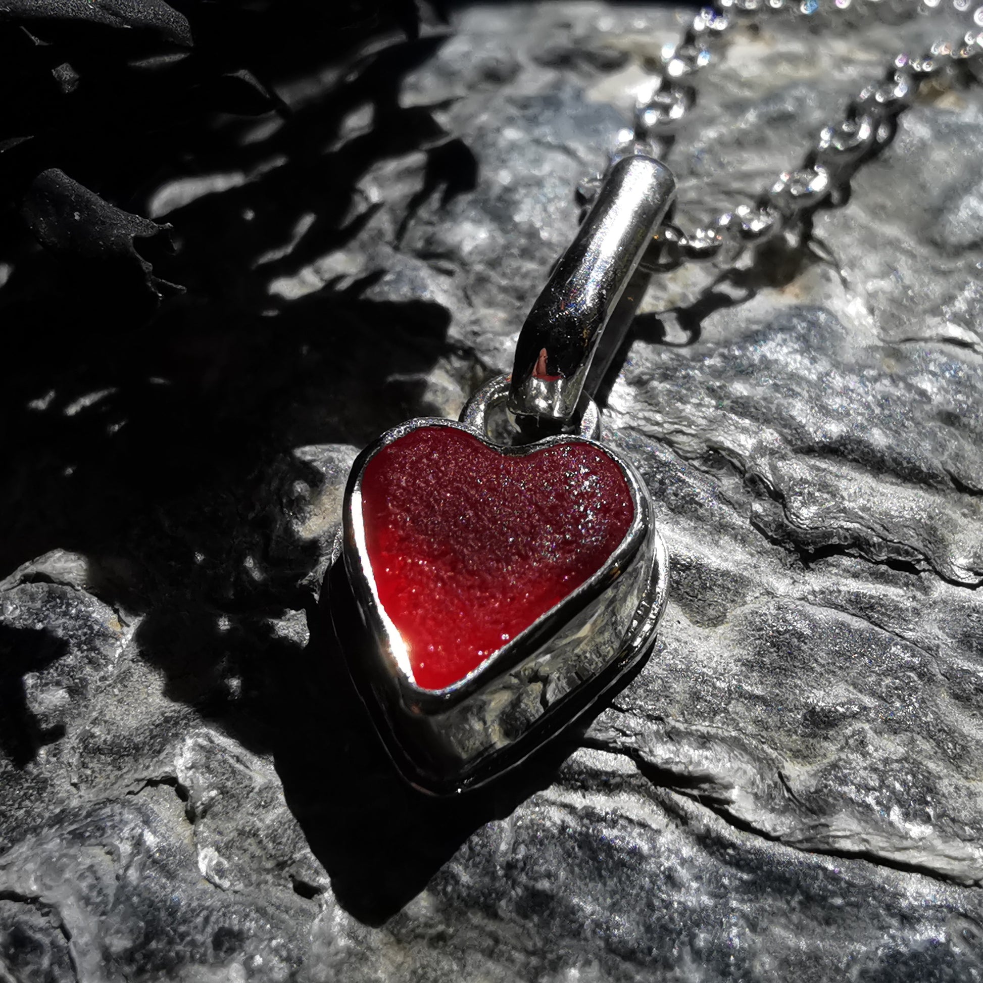 Tiny Scottish UV red sea glass heart & sterling silver pendant.