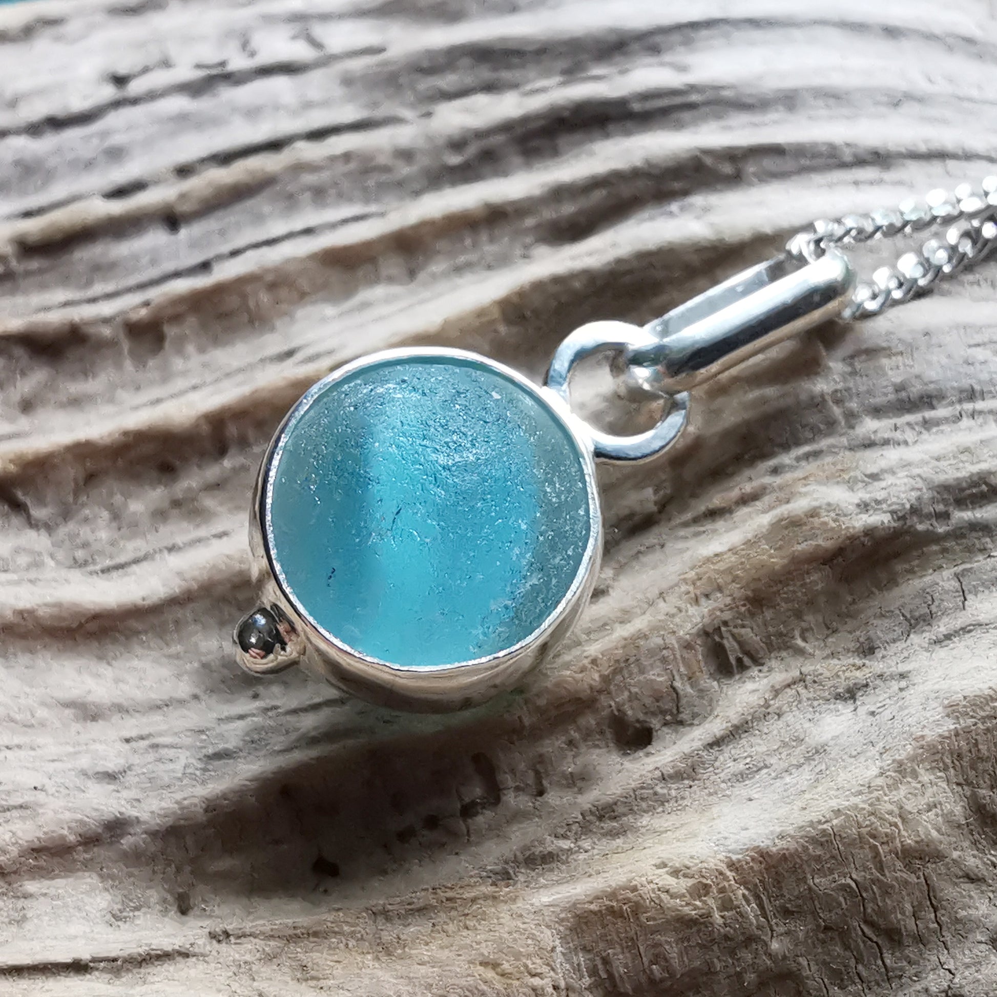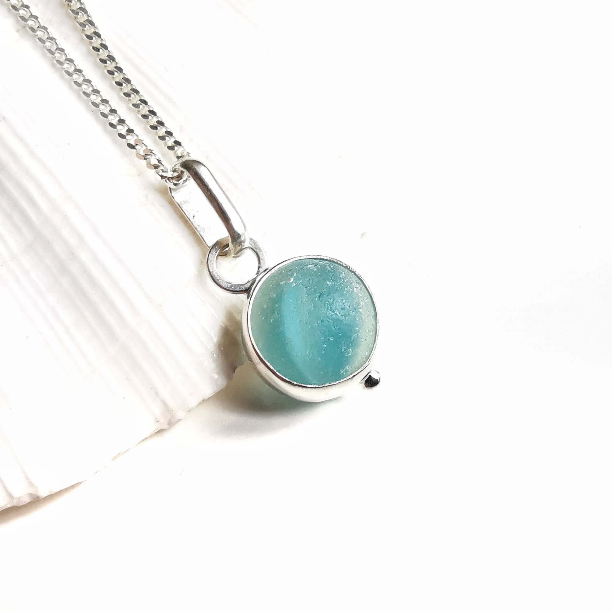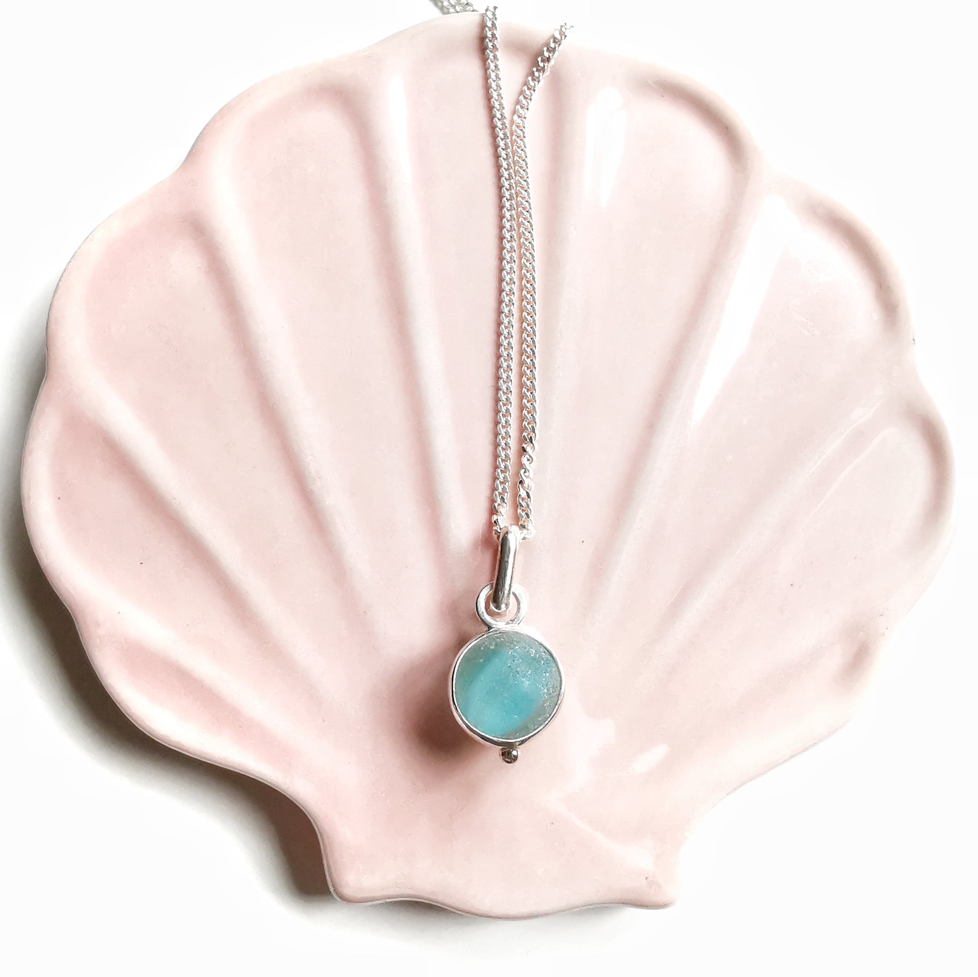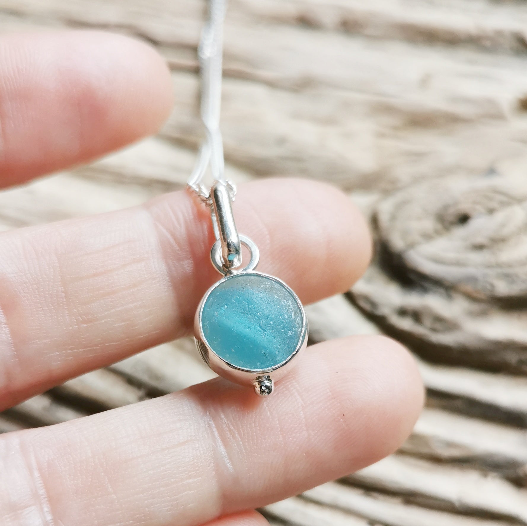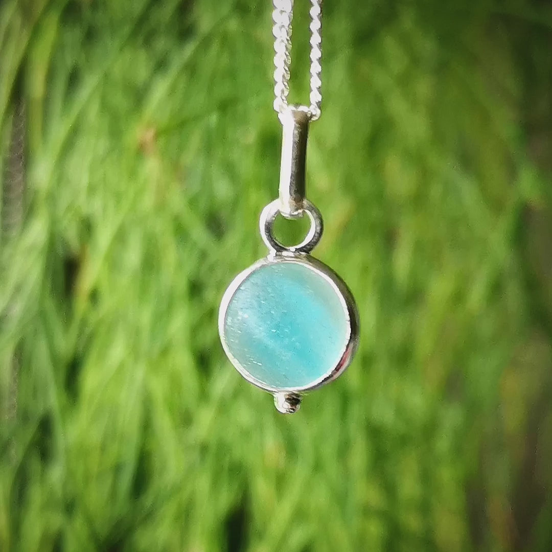 Tiny Seaham aqua blue sea glass marble & sterling silver pendant.