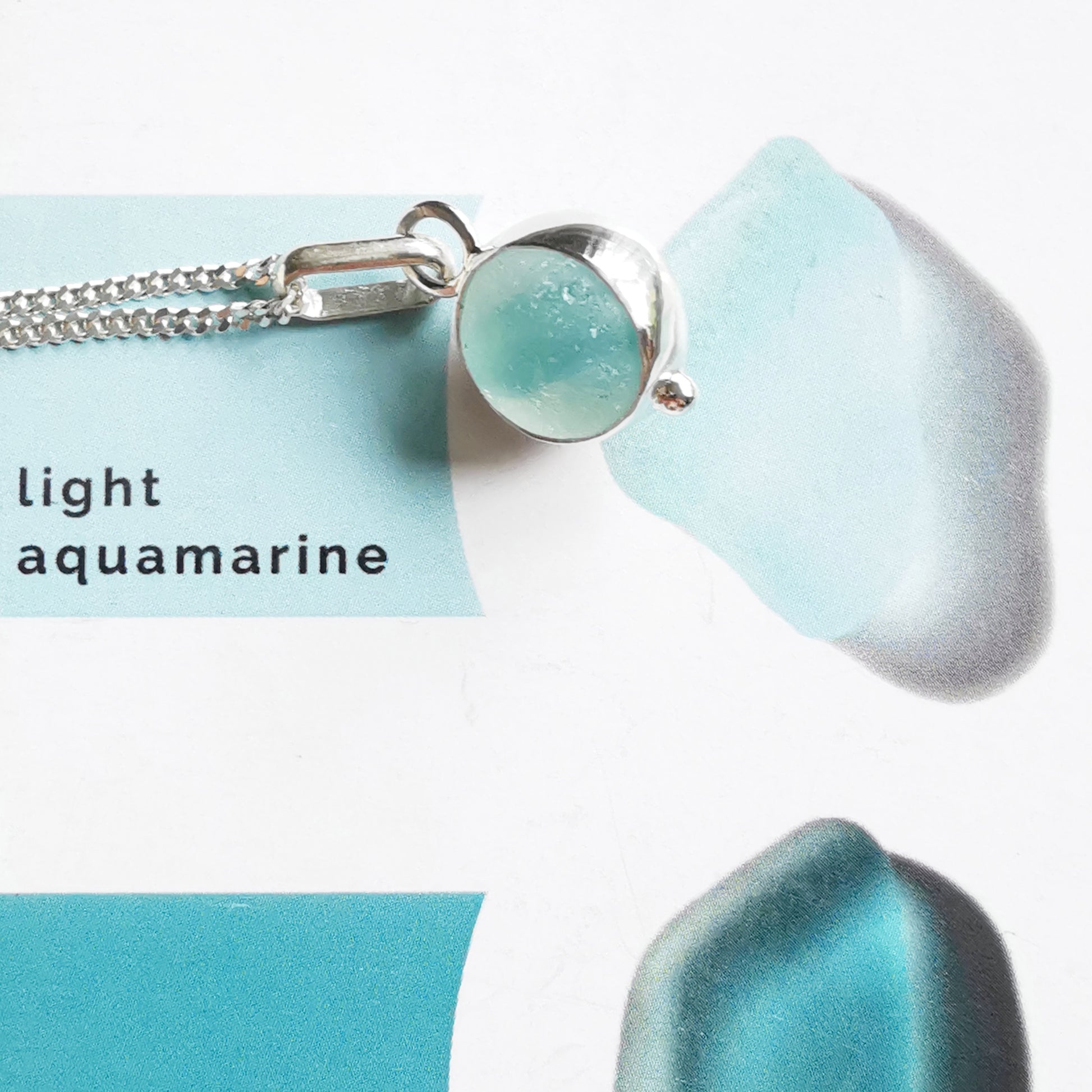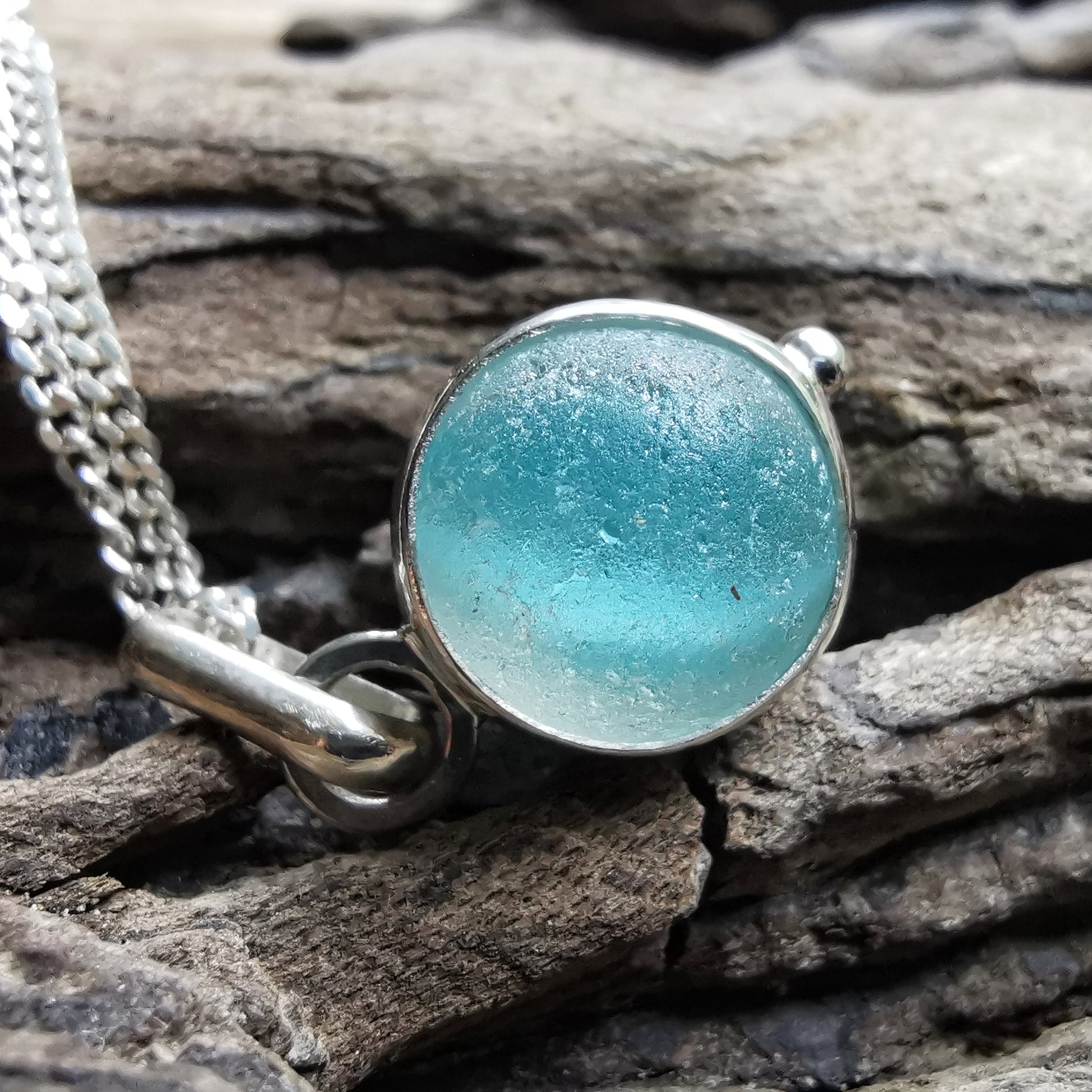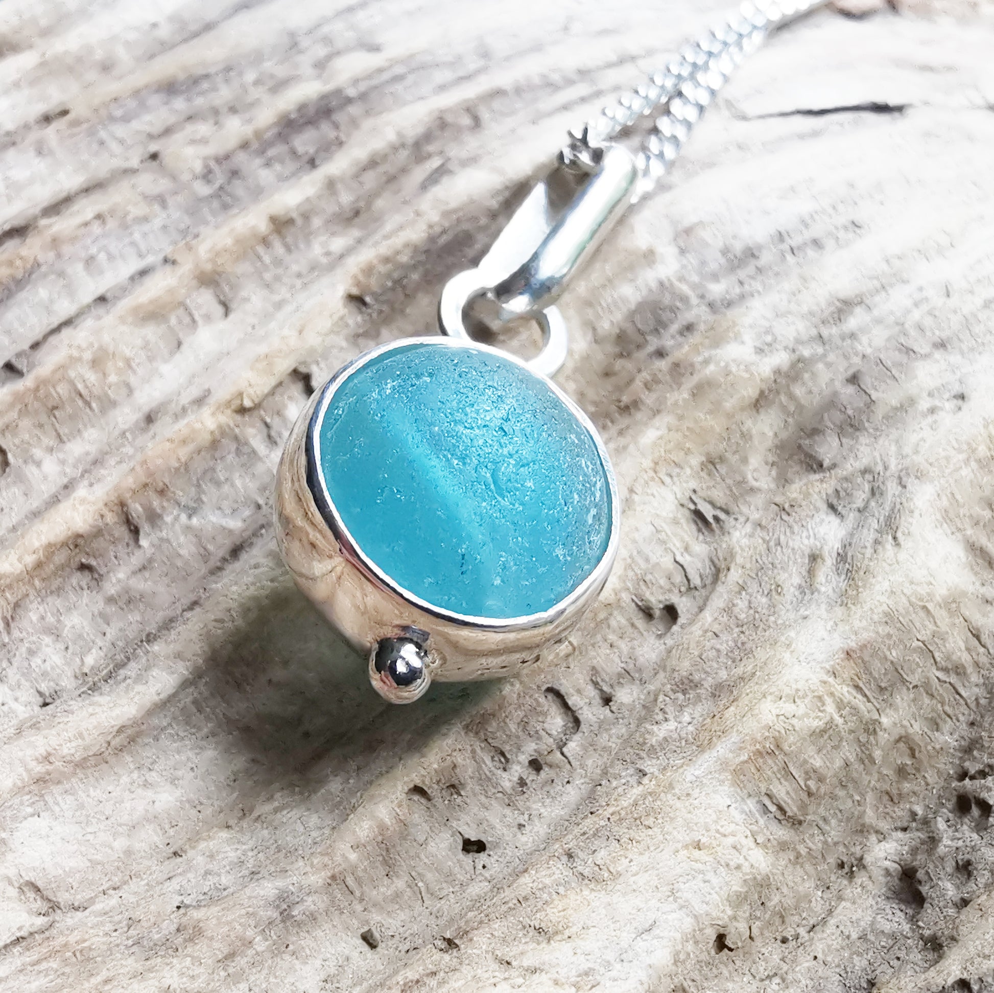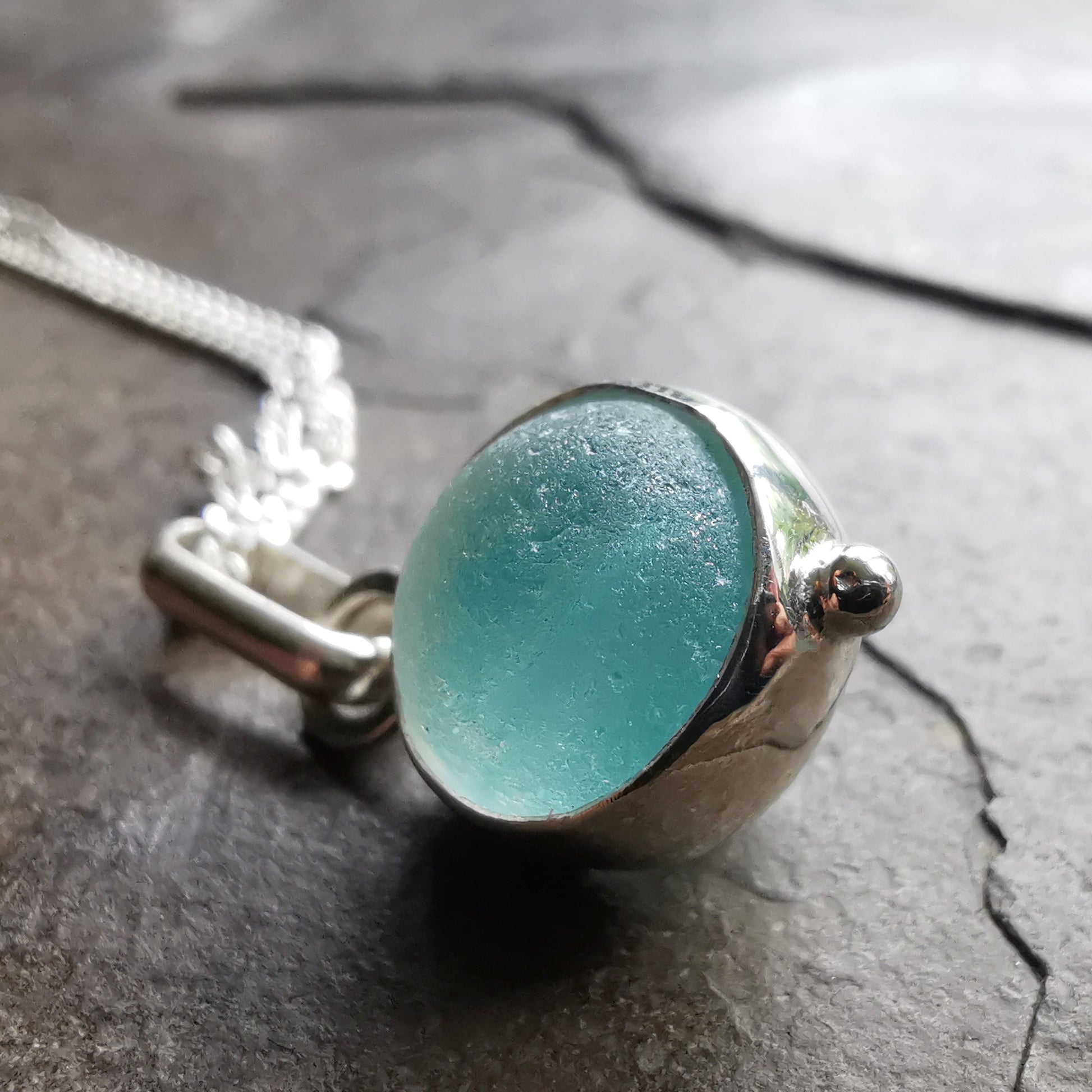Tiny Seaham aqua blue sea glass marble & sterling silver pendant.