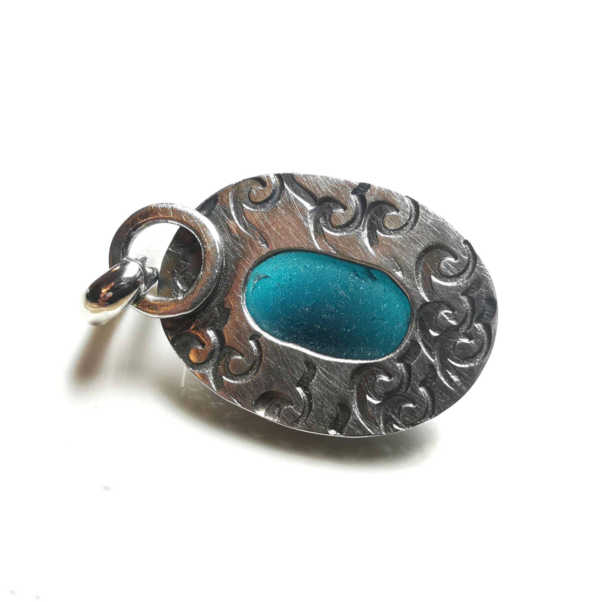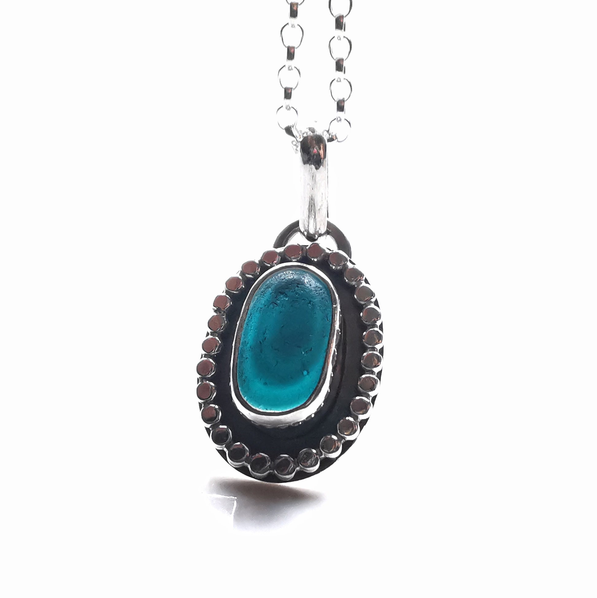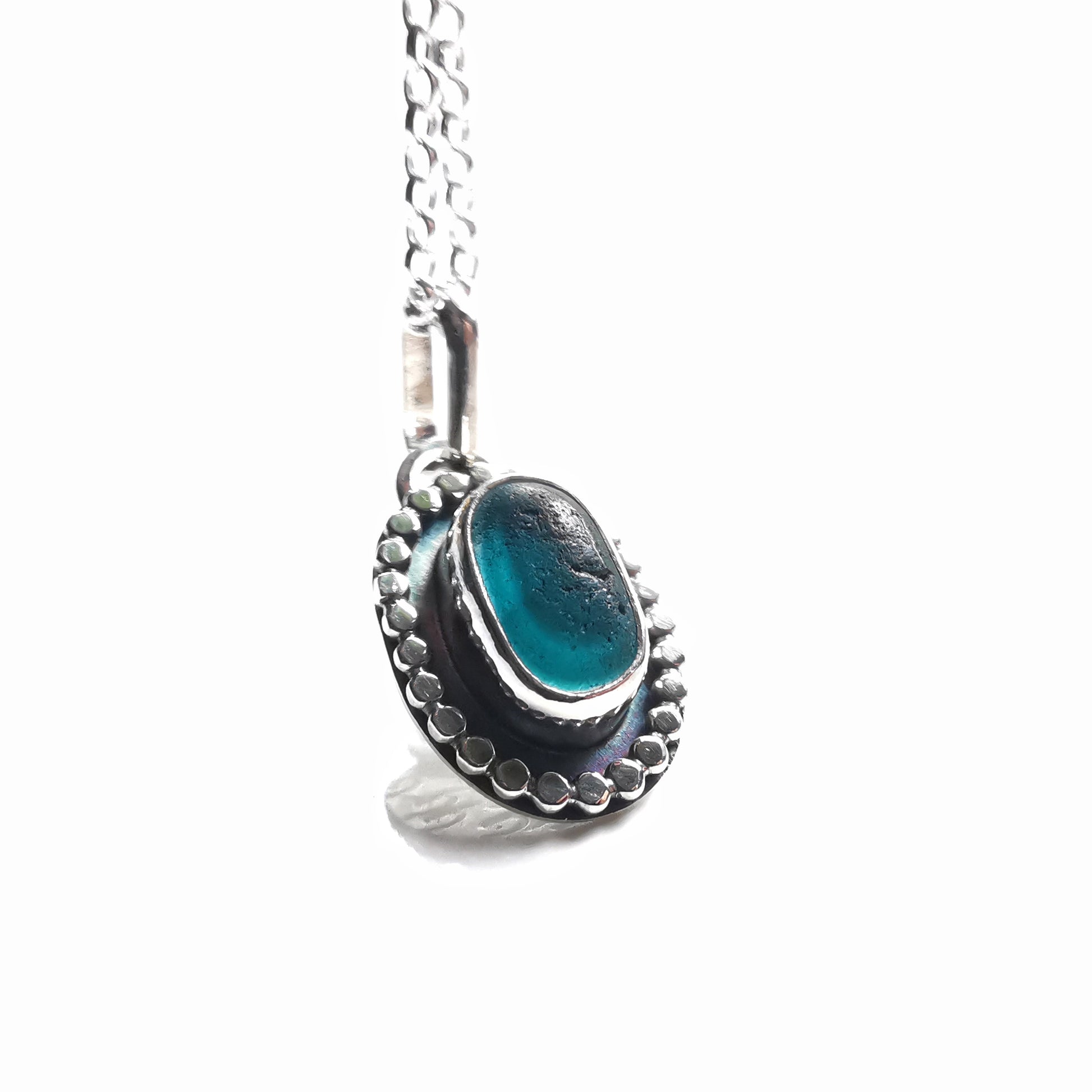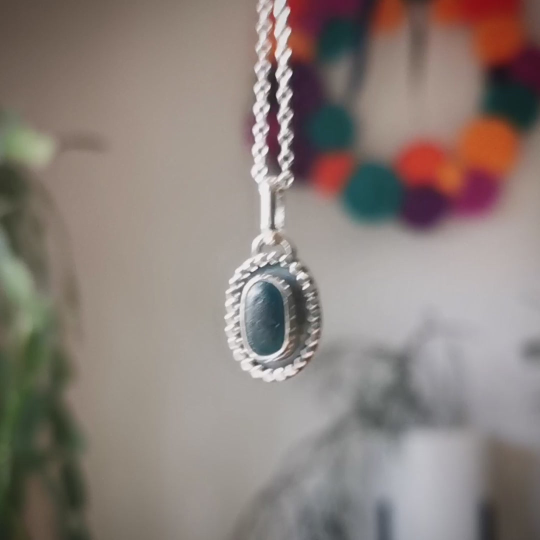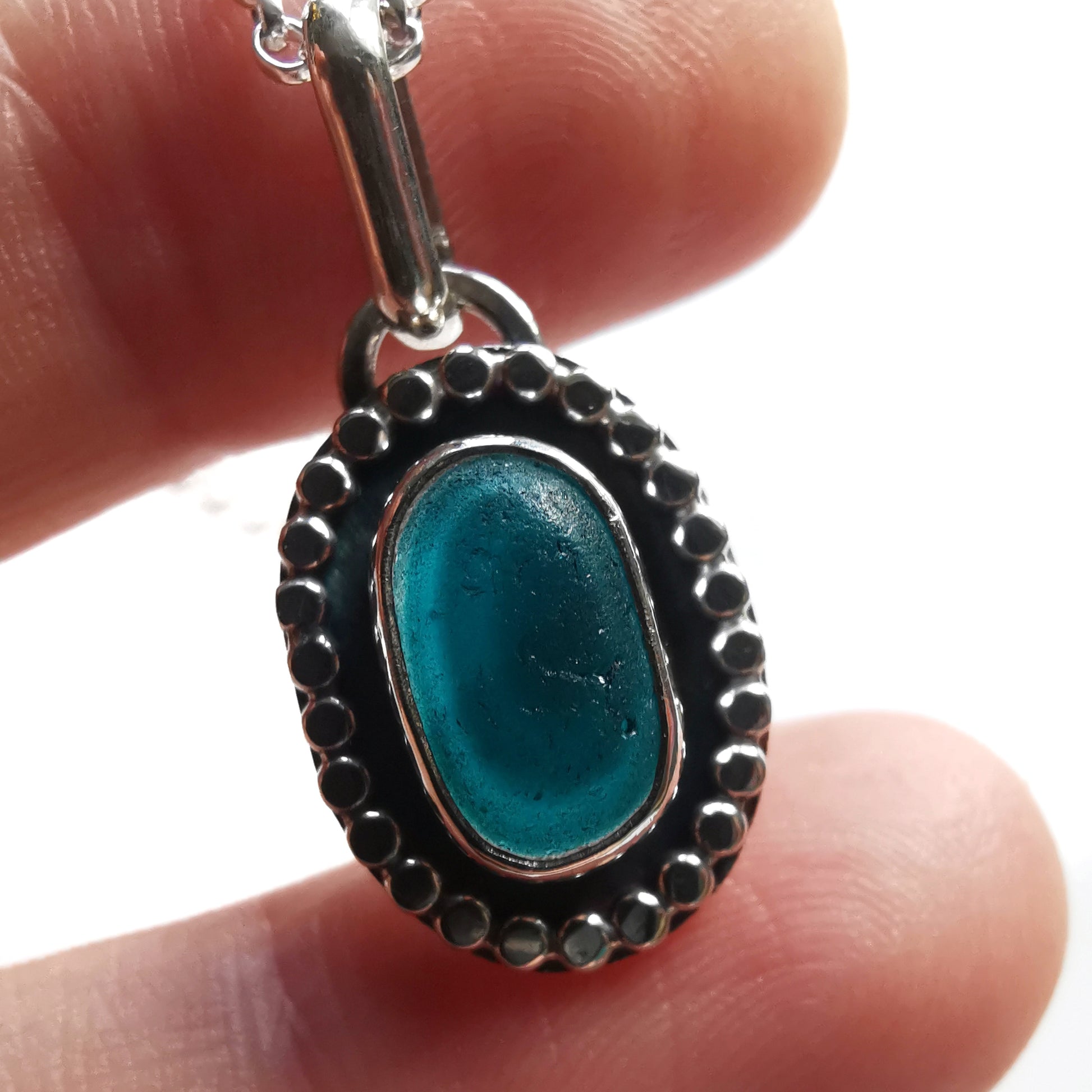 Tiny teal multi Seaham sea glass & sterling silver pendant.