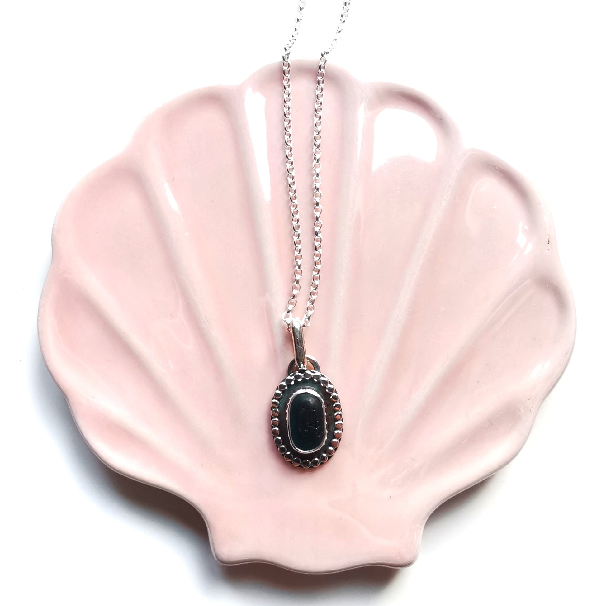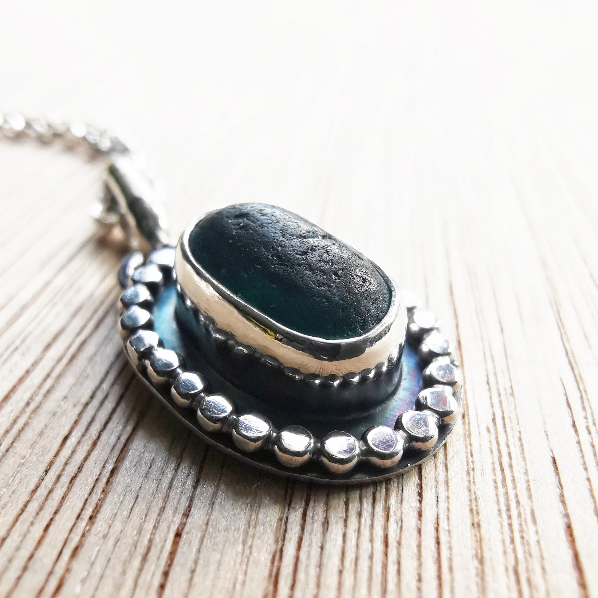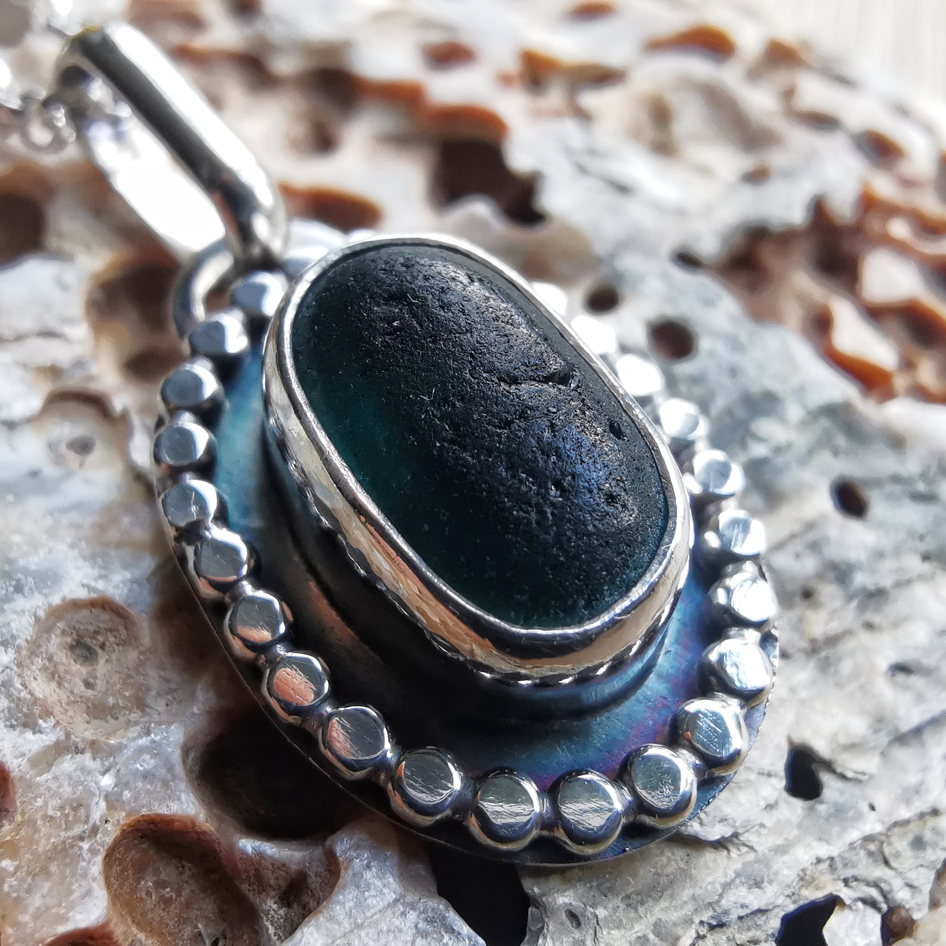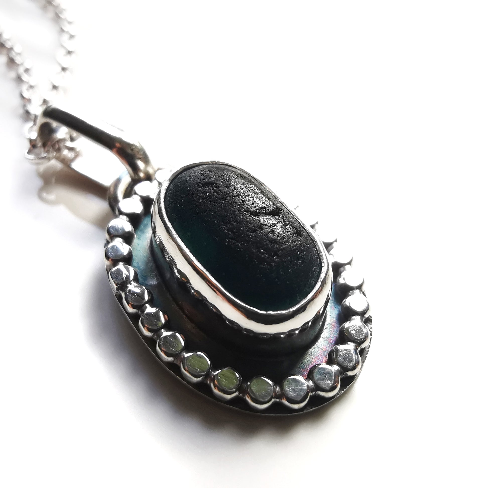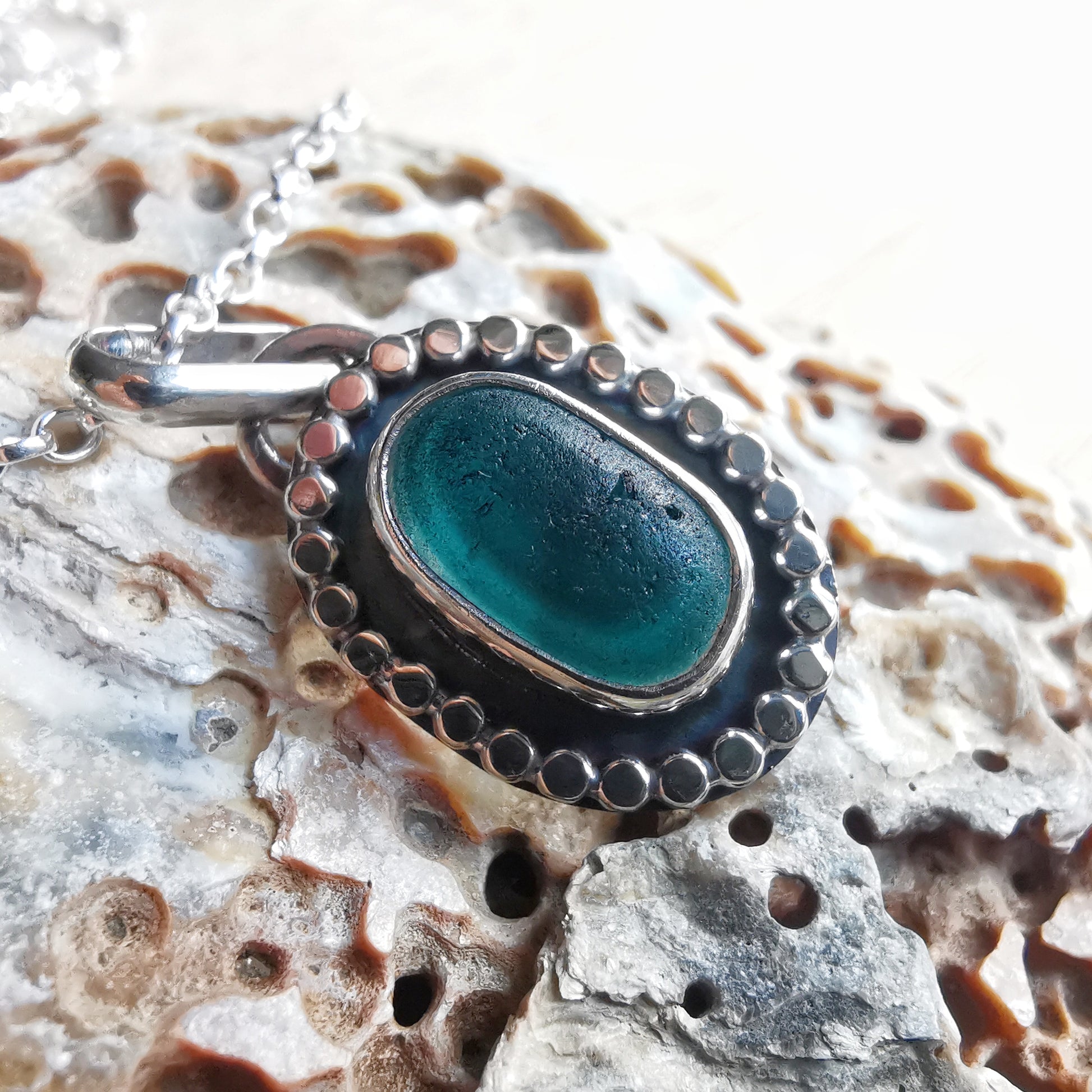 Tiny teal multi Seaham sea glass & sterling silver pendant.